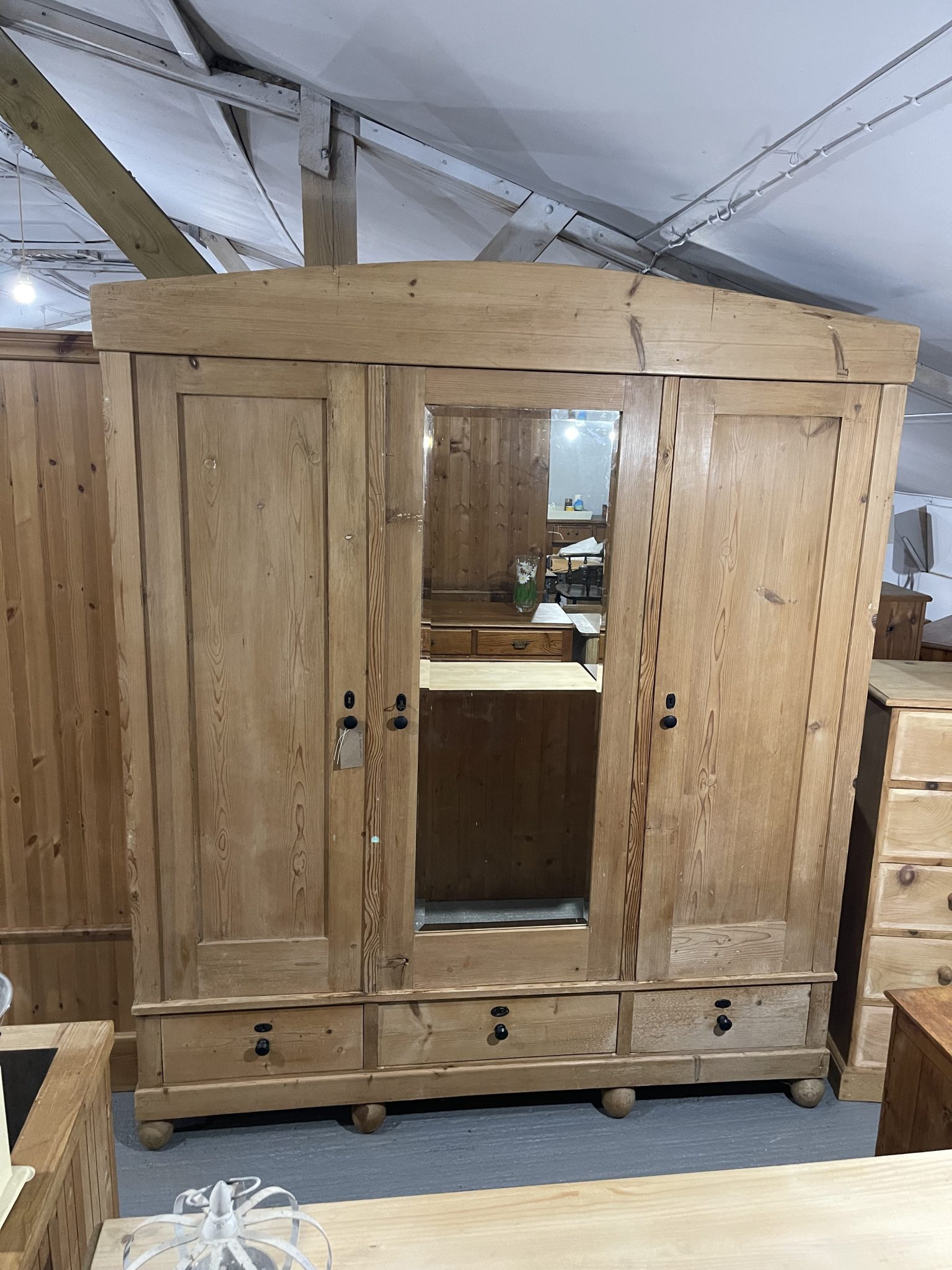 Large antique pine knockdown mirrored triple wardrobe in original condition, offering generous storage and classic character. Made from solid antique pine, this is a substantial and well-built piece that suits both period and traditional interiors.